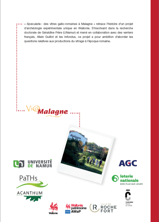 « Specularia : des vitres gallo-romaines à Malagne » retrace l’histoire d’un projet d’archéologie expérimentale unique en Wallonie. S’inscrivant dans la recherche doctorale de Géraldine Frère (UNamur) et mené en collaboration avec des verriers français, Allain Guillot et les Infondus, ce projet a pour ambition d’aborder les questions relatives aux productions du vitrage à l’époque romaine.